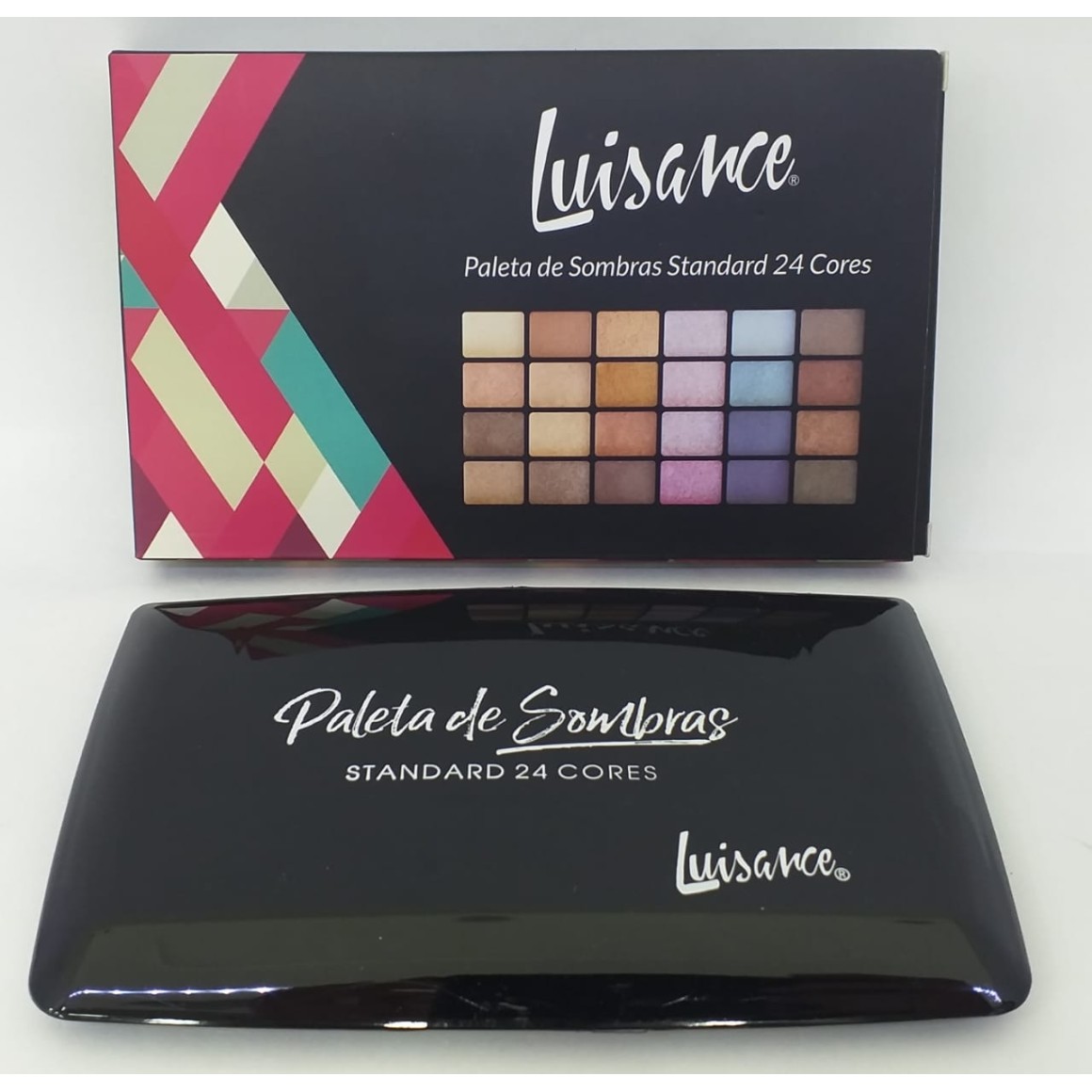- 24 cores de sombras cintilantes; - 1 pincel para aplicação (ponta dupla); - Estojo em acrilico com espelho interno.
