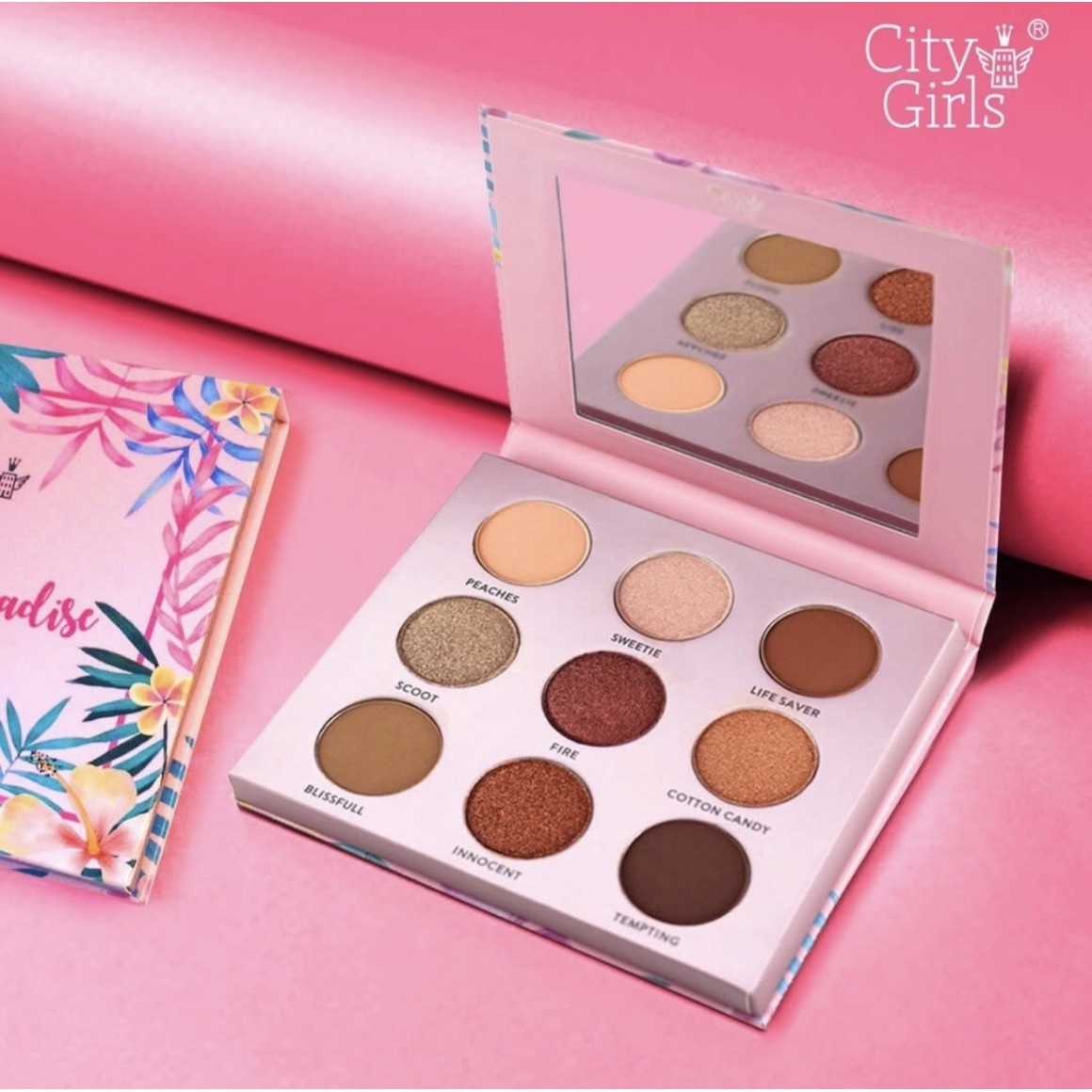 APaleta de sombras Tropical Paradise vem em 2 versões de 9 cores, entre peroladas e matte, versão Island Paradise (verde), possui 4 sombras matte e 5 peroladas, com tons mais frios e claros e versão Tropical Paradise (rosa), que possui 9 sombras , sendo 4 matte e 5 cintilantes em tons mais quentes.